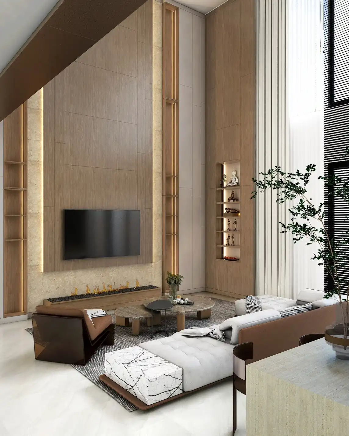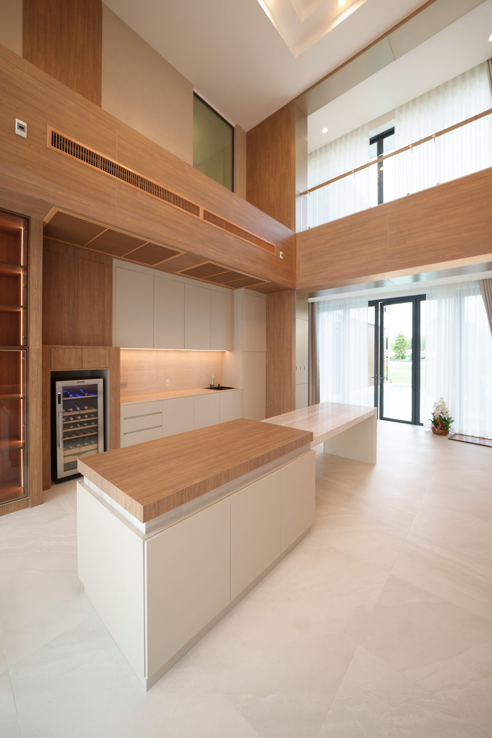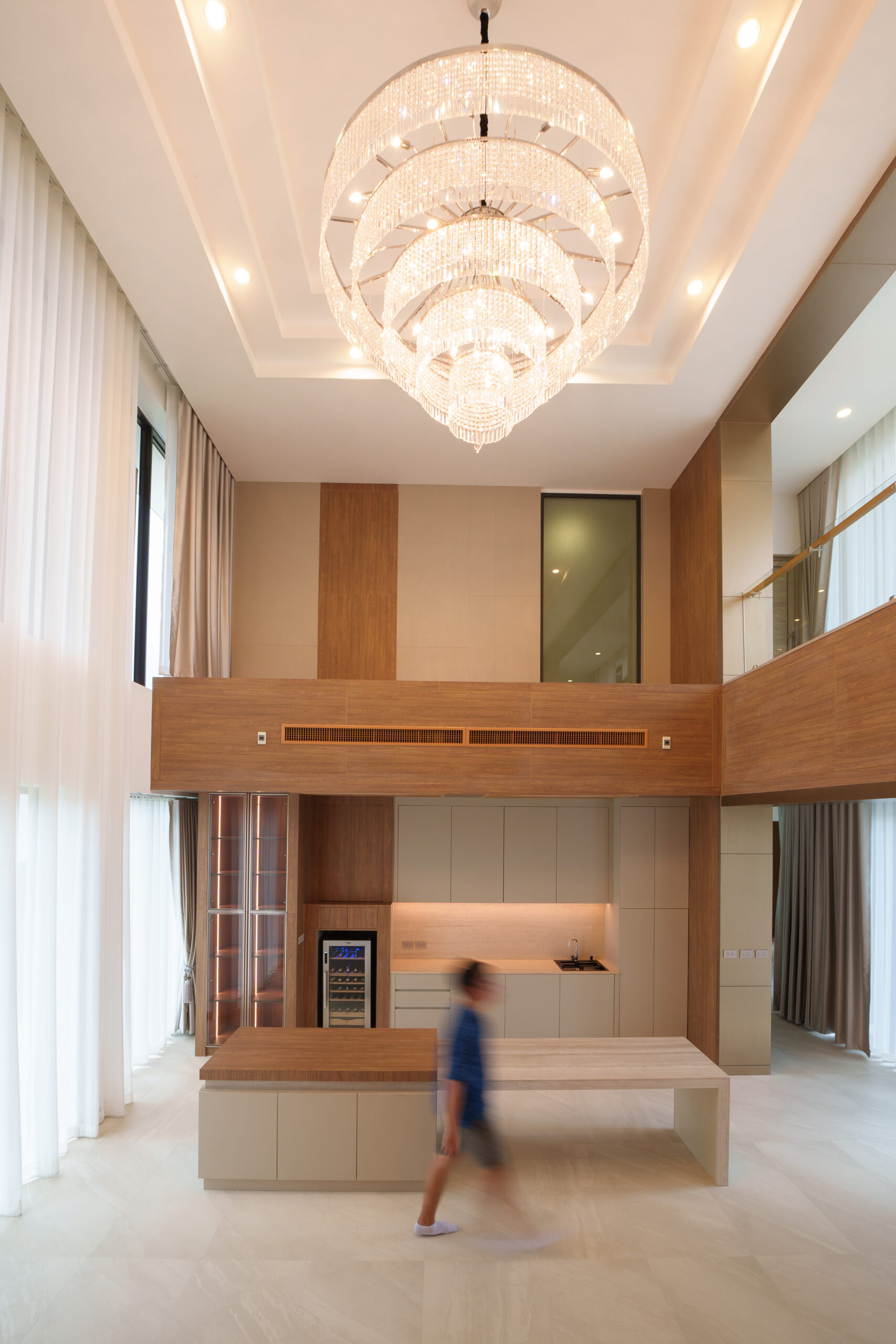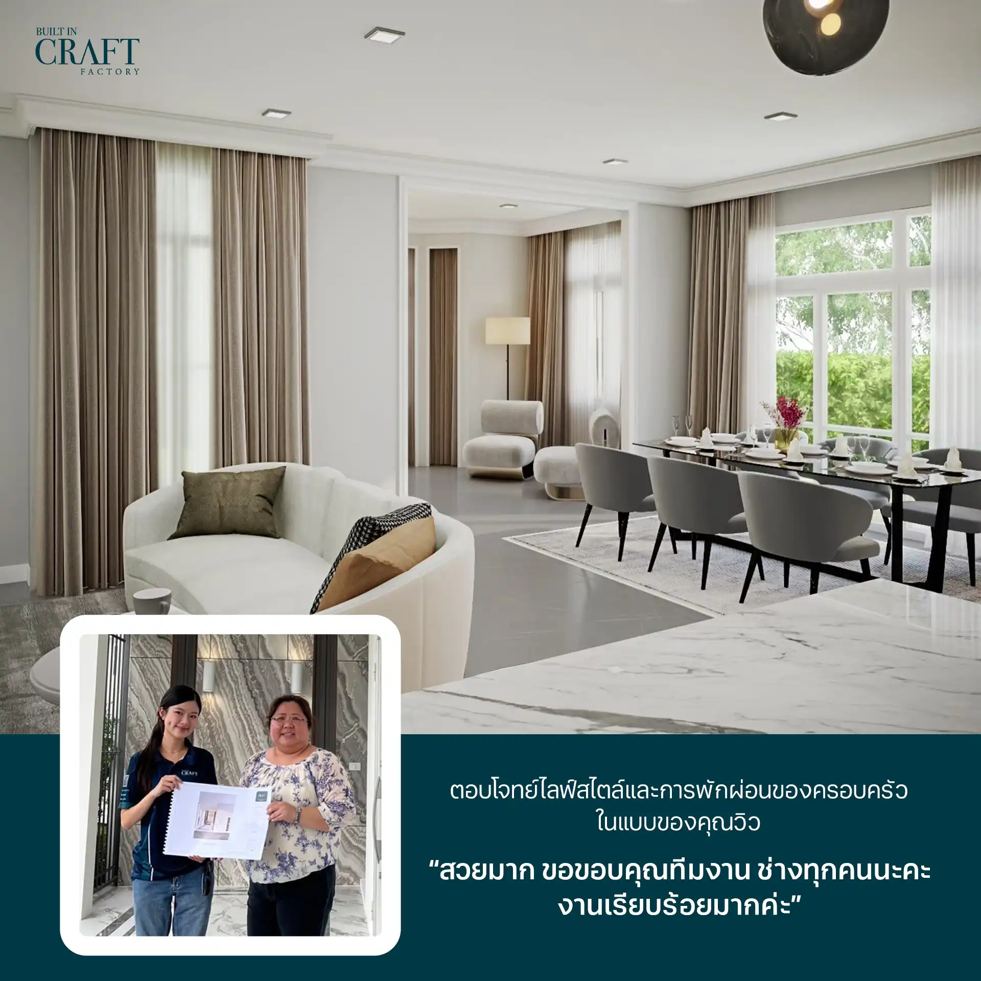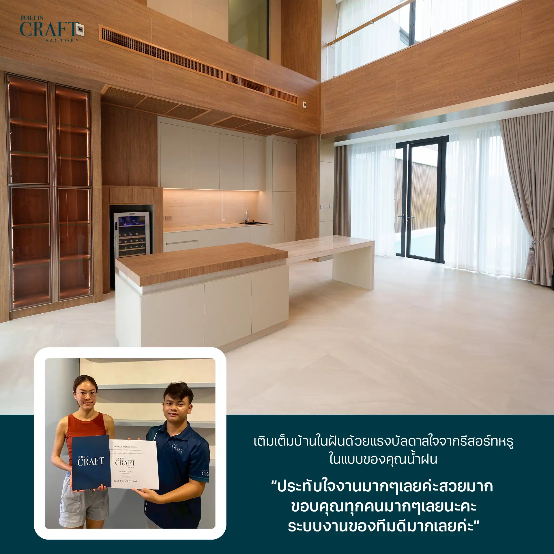 จากความฝันของคุณน้ำฝน สู่แรงบันดาลใจของทีม Built In Craft Factory – ออกแบบภายใน ขอนแก่น ซึ่งหลังนี้ทีมงานได้โจทย์หลักเป็นการออกแบบพื้นที่ของการพักผ่อนให้เหมือนได้อยู่รีสอร์ทหรู แต่ยังคงมีความสมดุลระหว่างความเรียบง่าย และความอบอุ่น Collection: Grand Resort SanctuaryStyle: Luxury Modern WarmthDesign: Built In Craft Factory เราออกแบบดีไซน์ให้เน้นพื้นที่โถงเปิดรับแสงธรรมชาติผ่านกระจกสูง 8